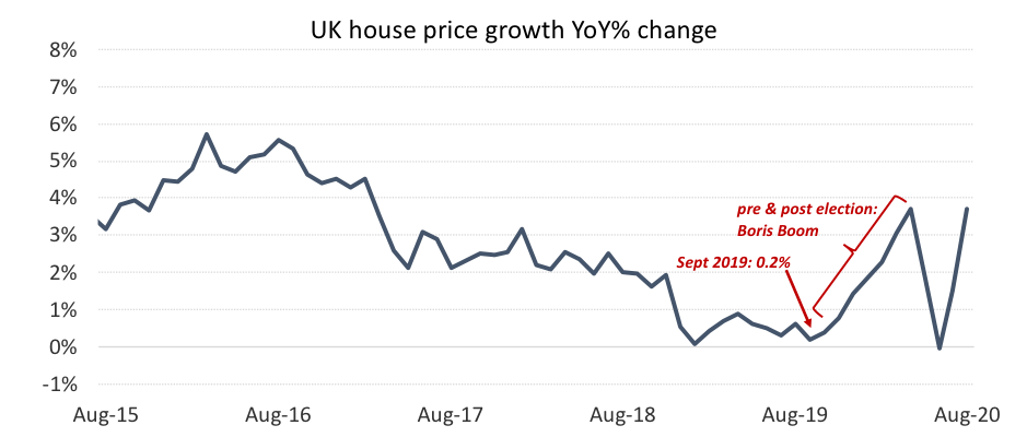 UK house prices have now reversed the losses recorded in May and June and are at a new all-time high. Indeed, data from the Nationwide House Price Index shows that following the strong rebound in UK house price growth in July, prices reached a record high in August. Annual house price growth picked up to 3.7% in August and prices were up by 2% month-on-month. The price rebound reflects the surprisingly rapid recovery in housing market activity since the easing of lockdown restrictions, which we believe is only partly due to the stamp duty holiday. We believe a number of other factors have contributed to this rapid recovery, namely buyers trying to secure mortgages before they expect to see job losses later this year and pent up demand where decisions taken to move before lockdown are progressing.
