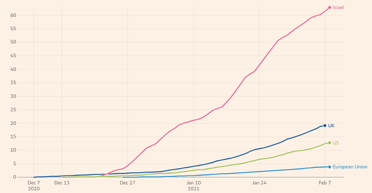Chart of the month: Cumulative vaccination doses administered in UK, Israel, US and European Union (Cumulative doses administered per 100 residents)