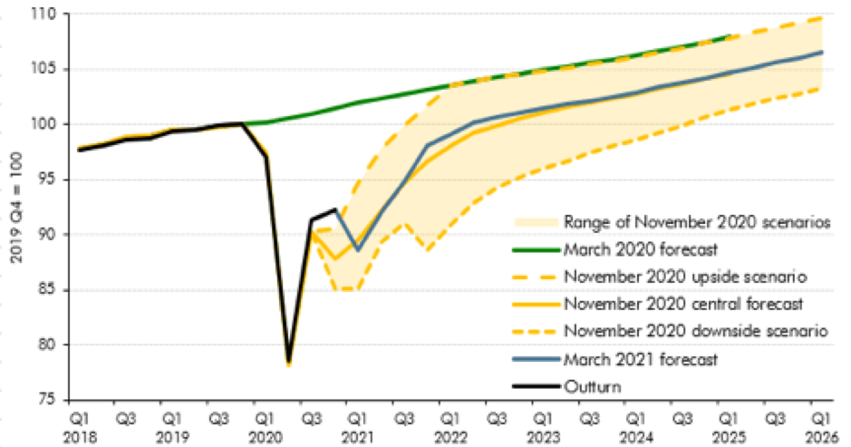 We are getting out of the woods and in the UK the number of people having already received their first dose of a vaccines has topped 20 million (at the time of writing). In its latest Economic and fiscal outlook published with the budget and Presented to Parliament, the Office for Budget Responsibility expects GDP to grow by 4% this year and regain its pre-Covid level in Q2 2022, six months earlier than it forecast in November. They expect unemployment to peak of 6.5% at the end of 2021, again less than the 7.5% expected in November 2020.