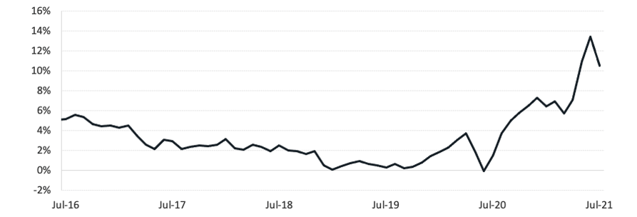According to the Nationwide House Price Index[i], annual house price growth remained in double digits but fell back to 10.5% in July, down from the 17-year high of 13.4% recorded the previous month (chart of the month). In month-on-month terms, house prices fell by 0.5%, after taking account of seasonal effects, following a 0.7% rise in June. The modest fallback in July was unsurprising given the significant gains recorded in recent months. Indeed, house prices increased by an average of 1.6% a month over the April to June period – more than six times the average monthly gain recorded in the five years before the pandemic. Furthermore, another possible explanation for the slowdown is that stamp duty changes have started impacting market dynamics by taking some of the heat out of the market. The nil rate band threshold decreased from £500,000 to £250,000 at the end of June, which provided a strong incentive for prospective buyers to complete house purchases before the end of June[ii].