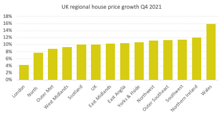 According to the Nationwide House Price Index, last year UK house prices grew at their fastest pace in seventeen years[i]. Three out of four quarters of 2021 saw average house price growth above 10% year-on-year (the last time this occurred was in 2004). The price of a typical UK home hit a record high of over £250,000, up nearly £24,000 over the year. Wales ended the year as the strongest region, with prices up by 15.8% year-on-year, followed by Northern Ireland where prices rose by 12.1%. In England, the Southwest was the strongest performing region, with annual price growth of 11.5%. The Outer Southeast, which includes cities such as Brighton, Southampton and Oxford, was also one of the strongest English regions in 2021. Looking forward, as discussed in our piece 4 property trends smart investors are watching for in 2022, we expect prices to continue to increase, but not at the speed witnessed throughout 2021. We also expect Levelling Up policies to continue closing the north-south housing divide.