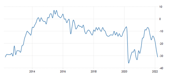 - According to the British Retail Consortium, growth in UK retail sales slowed last month as fears over the rising cost-of-living led to the sharpest drop in consumer confidence since the 2008 financial crisis. Sales rose by 3.1% YoY in March, significantly down on the 6.7% increase in February and the 12-month average growth rate of 10.3%[iii].